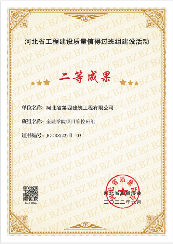 9月16日,六分公司收到了河北省质量协会颁发的证书,河北金融学院项目管控班组荣获“河北省工程建设质量信得过班组建设活动”二等成果,并被推荐到中国建筑业协会交流。